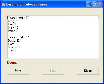 Score Tracker and Team Optimizer is a program that allows you to input any number of scores for any number of players. Typical scores you might keep track of are bowlers or golfers scores. You can view a list of these scores of each player, along with information on the number of scores, the total of the scores, and the average score of the player. You can also get a summary of all the players together, giving the number of scores, sum of the scores, and average score of each player (but not individual scores). This makes the program useful for general record keeping. However, Team Optimizer can do more. Once it has a list of players and their scores, it can create groups or teams using these players, where each group will either has the greatest possible similarity between people within a team or between teams.